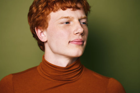 Portrait of a young man with red hair wearing a brown turtleneck sweater looking sideways against a green background. Closeup of face and thoughtful expression in studio lighting.