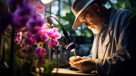 Garden botanist with rare orchid magnifying glass precision and research focus