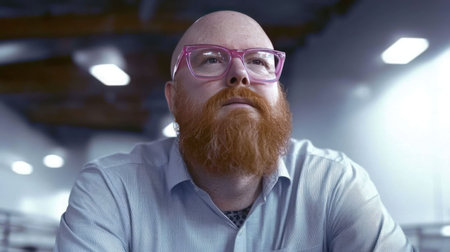 Portrait of a bald man with red beard and pink glasses, wearing a button-up shirt, looking upward with a thoughtful expression, seated in a softly lit office environment, minimal d