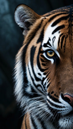Close-up of tiger's eye, looking straight ahead with concentration, against a dark, blurry background. Generative AI