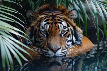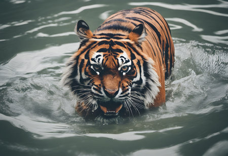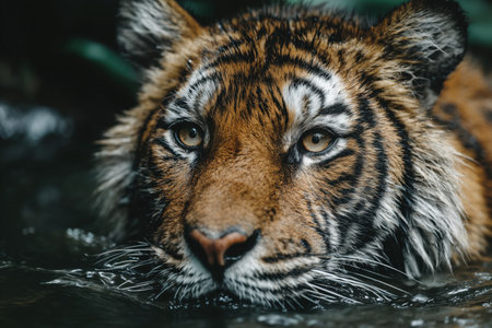 This striking close-up captures the intense gaze of a tiger partially submerged in water. The rich colors and detailed fur highlight the beauty and majesty of this magnificent animal in its natural habitat. ai generated.