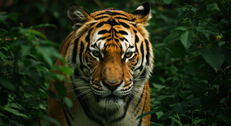 Tiger looking directly forward from behind green foliage, blending into the surrounding dense jungle environment, showing its powerful gaze and natural habitat
