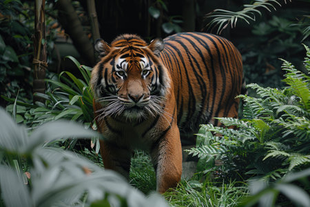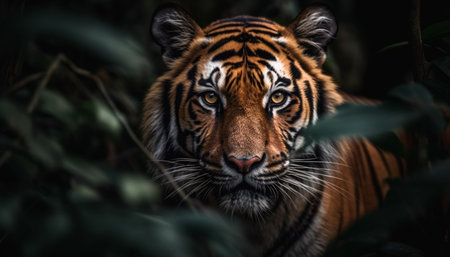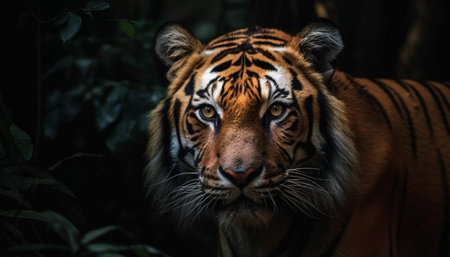 Majestic tiger staring with aggression in tropical rainforest portrait generated by artificial intelligence