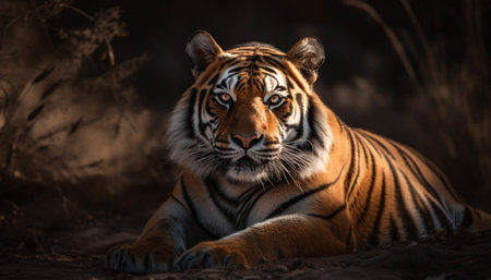 Majestic Bengal tiger staring at camera in wildlife reserve portrait generated by artificial intelligence