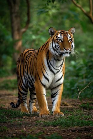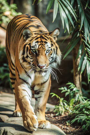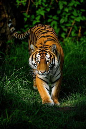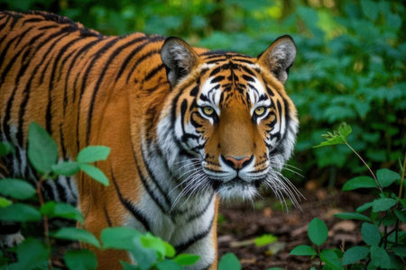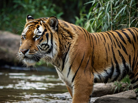 An AI generated illustration of A majestic tiger stands alert amidst a lush jungle setting, its watchful gaze pointed toward the camera