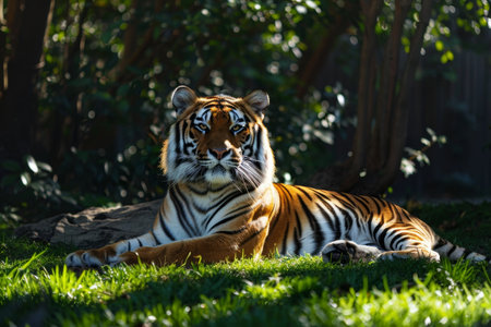 A tiger is lying down in the grass near some trees, A regal tiger lounging in the sun