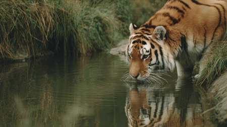 A tiger is seen near water, possibly a river or pond, in a natural outdoor setting. The image features warm colors and clear reflection of the animal. This imagery could be used for wildlife documentaries, educational materials, or environmental projects.