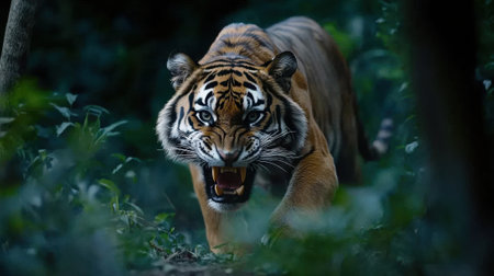 A tiger is walking through the forest with its mouth open, showing its teeth. Concept of danger and wildness, as the tiger is a powerful and potentially dangerous animal