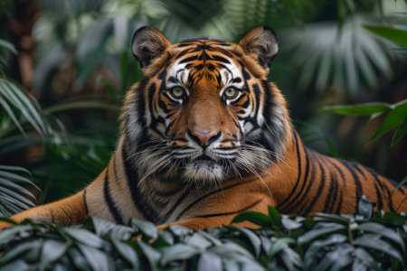 Tiger rests in tropical forest shade, showcasing exotic wildlife beauty.