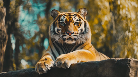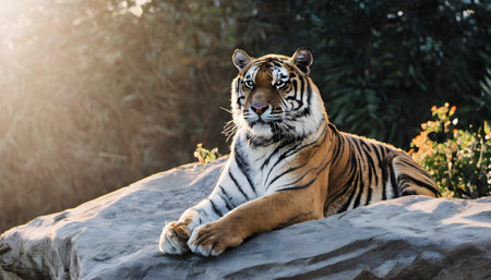 A close-up of a majestic tiger lounging in its enclosure, with emphasis on its powerful build and striking orange coat against a natural backdrop.