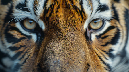 Detailed view of a tigers face with sharp focus on its eyes, nose, and whiskers against a blurred background, A close-up of a tiger's piercing eyes
