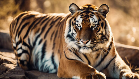 An intense eyed tiger rests gracefully in its natural habitat, surrounded by vibrant greenery, capturing the essence of wildlife.