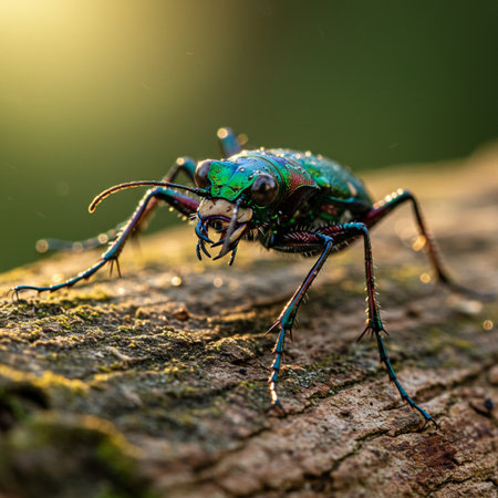 tiger beetle moves swiftly across the surface, its iridescent body glinting in the light. Its elongated legs and fierce mandibles make for an impressive predator.