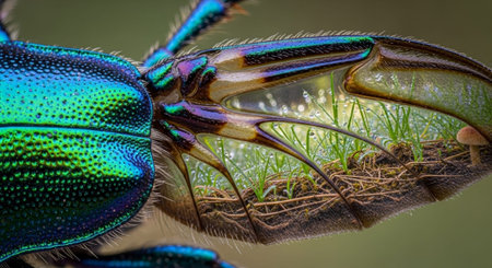 close-up of a vibrant iridescent beetle on a leaf, created with generative ai