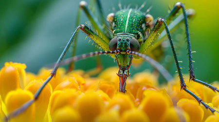 Insect on a bright green leaf, featuring a detailed shot of its legs and antennae, with a focus on the contrast between the insect and its environment