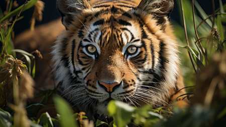 A majestic tiger with piercing eyes rests in lush foliage, highlighting the beauty and power of this magnificent predator.