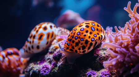 A stunning underwater scene featuring colorful sea snails resting on a coral reef. The vibrant patterns and textures showcase the beauty of marine life in a natural habitat.