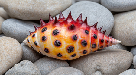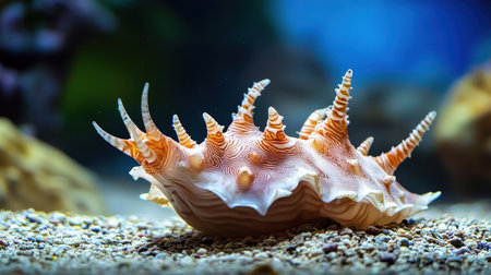 A detailed view of a spiky seashell resting on the sandy bottom of the ocean, showcasing its intricate texture and unique form.