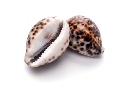 Cypraea Mauritania and Cypraea tigris shells isolated on white background