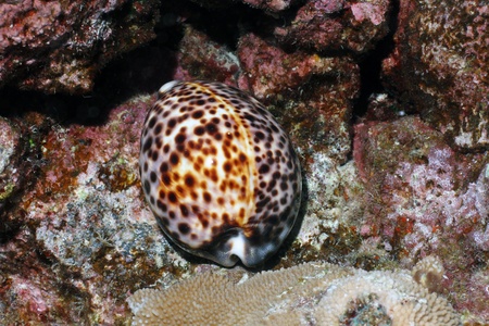 Tiger Cowrie sea shell underwater. Shell on the seabed