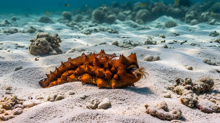 A spiky orange sea cucumber rests on the sandy ocean floor against a backdrop of deep blue water. This marine invertebrate highlights the diverse and fascinating wildlife found in tropical underwater ecosystems.