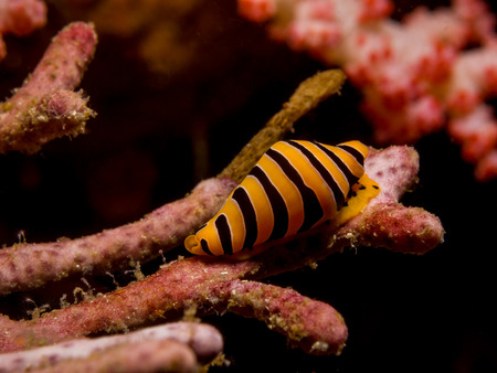 Underwater impage of Yellow And Black Striped Tiger Cowrie