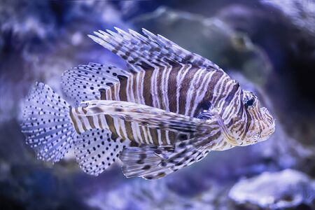 Zebra lionfish or zebra fish or striped lionfish lat. Pterois volitans is a species of ray-finned fish of the scorpion family in an aquarium on a blue background
