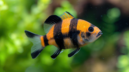 Close-up Portrait of an Orange and Black Reef Fish with Striking Eyes in a Natural Aquarium Setting