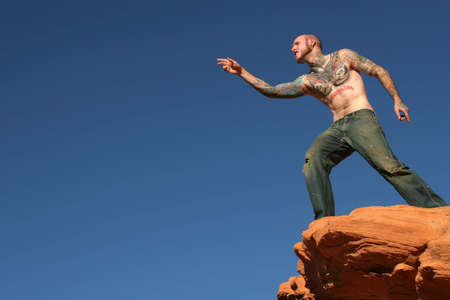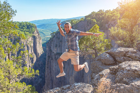 Man in a plaid blue shirt and cap jumps run smiling and shouting on the edge of deep canyon cliff, raising one hand up, beautiful scenery around