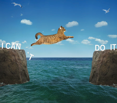 A brave cat jumps over the strait. I can't do it. Positive motivation.