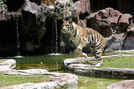 Bengal Tiger walking in the zoo. (Panthera tigris)