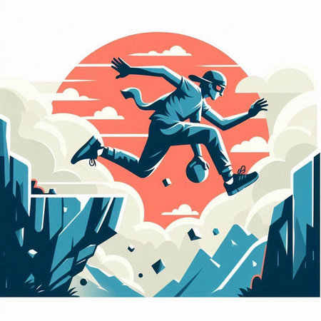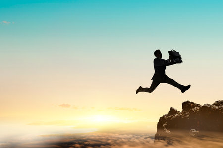 Ambition concept with a daring man jumping into the void to pass an obstacle and achieve his goal.