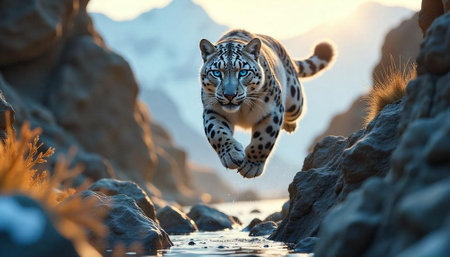 Majestic Snow Leopard Leaping Over Mountain Stream at Sunrise