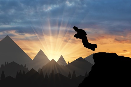 Man jumps from cliff to cliff over a precipice at sunset, a creative idea. Success and Risk Concept