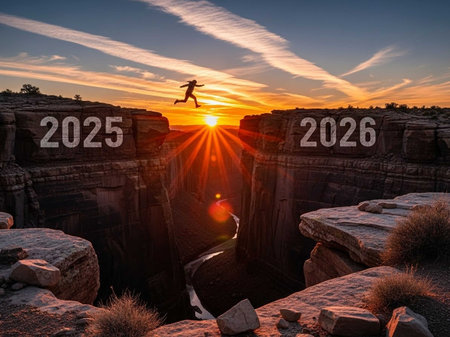Conceptual business man jumping over a gap between 2025 and 2026 on sunset background