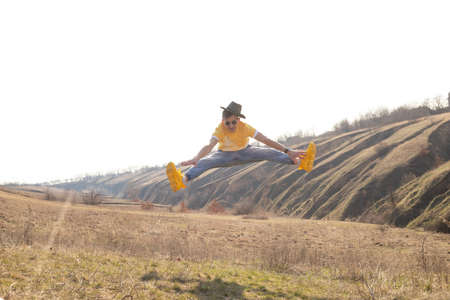 A young man jumping yellow t-shirt and white sneakers in spring mountains at sunset and enjoying view of nature. Mountain and coastal travel, freedom and active lifestyle