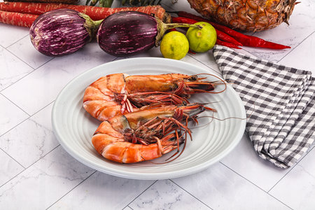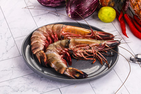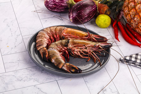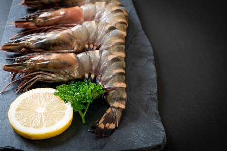 Fine selection of jumbo shrimps for dinner on stone plate.