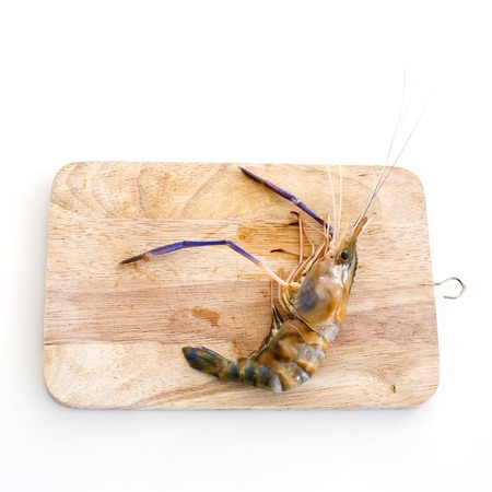Fresh raw shrimp with a lot of eggs arrange on wood tray ready for cooking