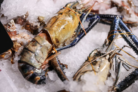 Fresh malaysian freshwater prawn on ice, closeup. fish store