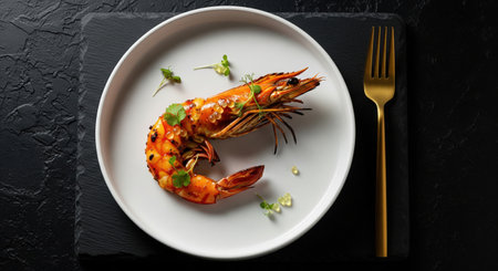 Photography of a giant gambas prawn on slate background for food illustrations / Also called black tiger shrimp, this crustacean can reach a length of 17 cm