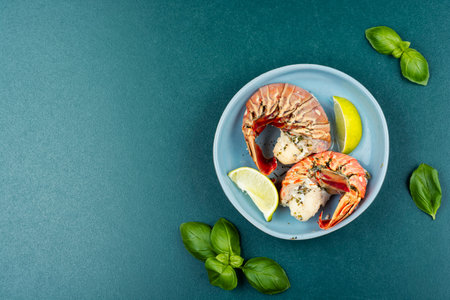 Two lobster tails on plate with spices for dinner. Holidays food concept. Copy space.