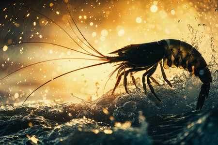 Freshwater giant river prawns in a clear oxygenated tank, showcasing their blue claws and segmented shells, waiting for selection in a seafood restaurant or market with a focus on freshness and quality