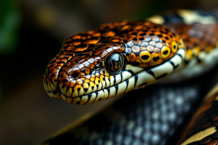 Colorful snake with intricate patterns resting peacefully in a calm environment