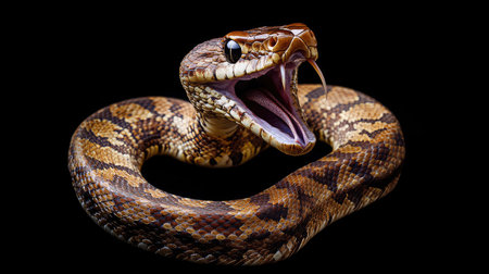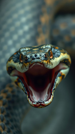 Captivating close-up of a striking snake with an open mouth revealing sharp fangs