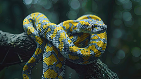 Colorful snake curled up on a branch in a lush tropical environment displaying its intricate patterns and vibrant colors