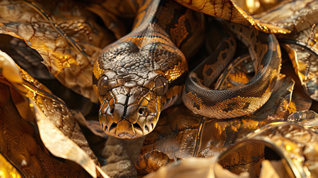 Reticulated Python (Malayopython reticulatus) is a python species native to Southeast Asia. Reticulated Python camouflage on dry leaves. AI Generated.