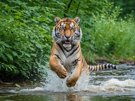 Siberian Tiger running in water. Beautiful, dynamic and powerful photo of this majestic animal. Set in environment typical for this amazing animal. Birches and meadows