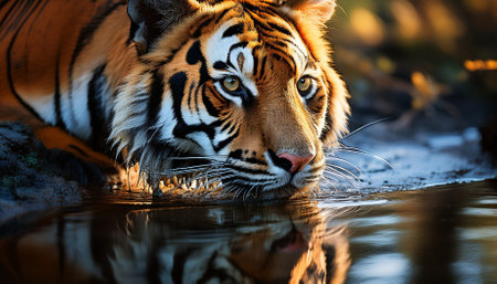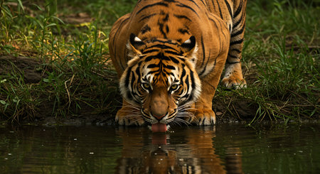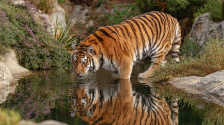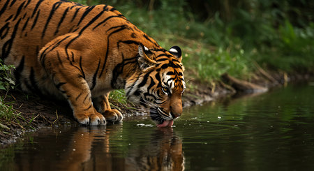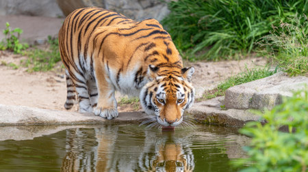 A Bengal tiger is drinking water from a pond. The image displays the tiger's distinctive striped pattern and orange fur. The scene features natural lighting and a realistic environment. Suitable for a variety of editorial and commercial applications. The composition shows the animal's reflection.