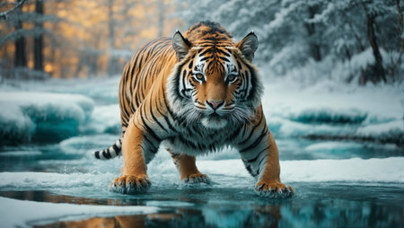 A stunning image of a majestic tiger walking gracefully along a frozen riverbank, surrounded by a serene winter landscape, evoking a sense of solitude and beauty.