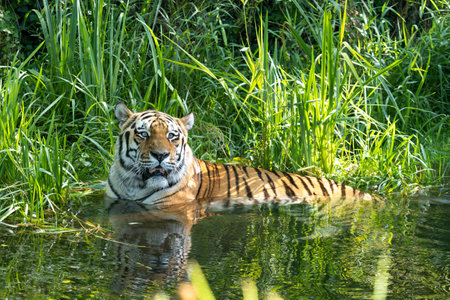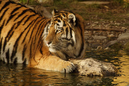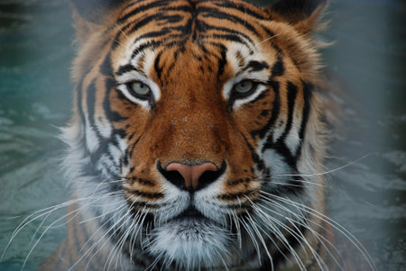 Detail of a tiger - panthera tigris - bathing in a refreshing water
